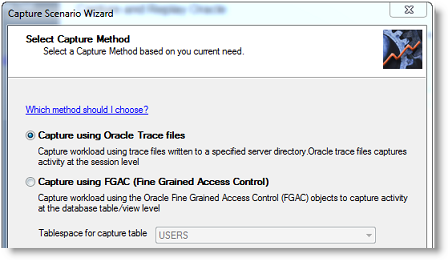 9. Select Capture Method. On the Select Capture Method page, select a capture method to use. For help selecting a capture method, see Trace Files or Fine Grained Access Control: Pros and Cons. Review the options below. Click Next when finished.