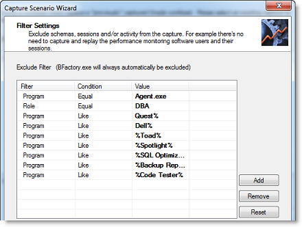 • Database objects created by Benchmark Factory for the capture process are automatically dropped after the capture is finished.