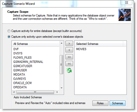 13. Capture Scope. The Capture Scope page allows you to select schemas for capture. You can select the entire database or use the list to select specific schemas. Review the options below. Click Next when finished.