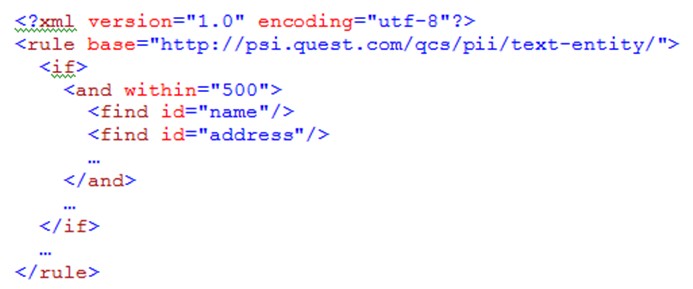 The id attribute is required. Use the id defined in the text extractor XML. If the URI of the extractor is the same as your rule, you can use the id alone; if it is different, use the full path of URI/extractor ID. For example, in the above example, the extractor “ssn” is assumed to be contained in the URI “http://psi.quest.com/qcs/pii/text-entity/.