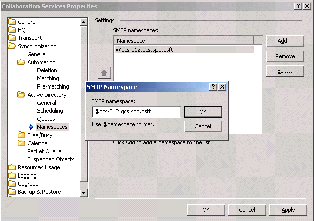 The Namespaces page of the Collaboration Services Properties dialog box allows you to add new namespaces or edit existing namespaces if your policy has changed since Collaboration Services setup.
