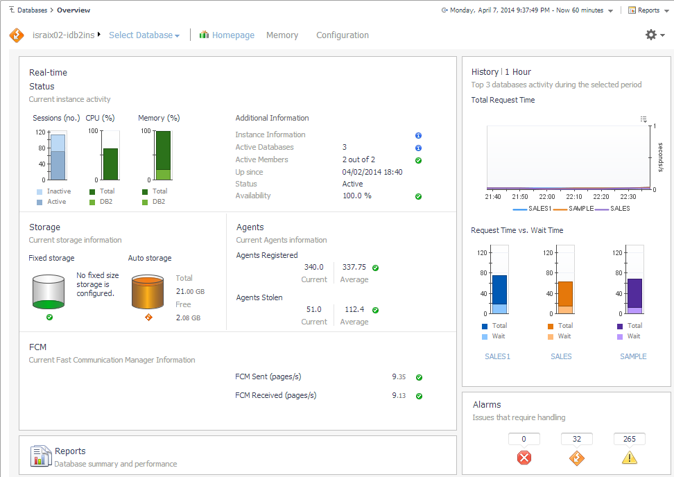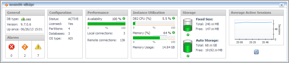 Alarms, . The numbers of Fatal alarms associated with the selected database instance.