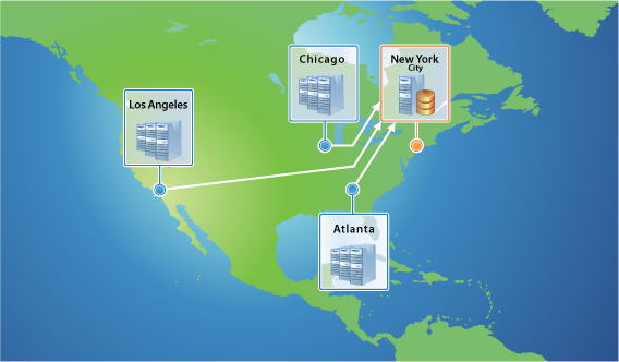 Figure 3 outlines a three cluster implementation of Enterprise Reporter. The server and database are located in New York, with clusters in three other cities. Each cluster contains 3 nodes.