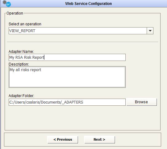 To use the adapter for RSA Archer, to read report contents, fill the field “Web Service Home URL” with the RSA URL you want to connect to.