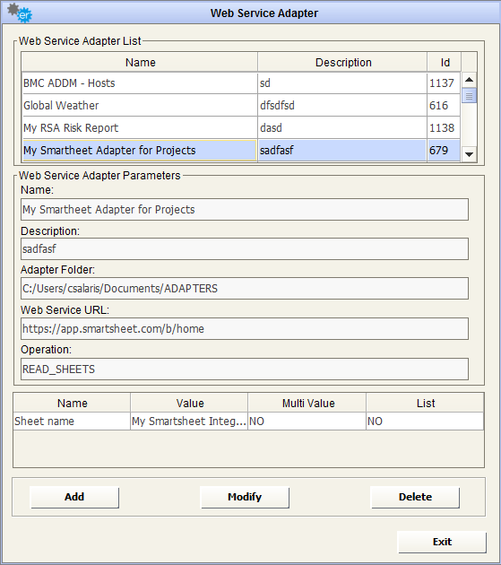 The first group of fields in the window relate to the Web Services Adapter List, which lists all the available adapters. For each adapter selected in the list, the Web Services Adapter Parameters fill the second group of fields, which describe the Web Service connection parameters and the third group of fields show the expected input parameters for the execution of the adapter.