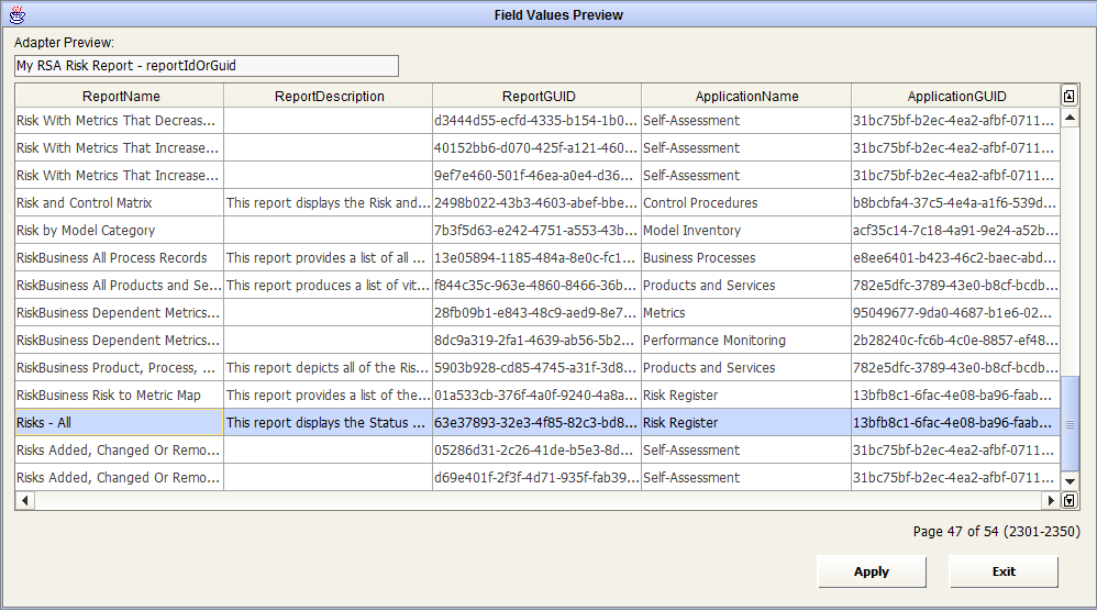 In the case of the RSA Archer “View Report” operation,  double-click on the lens icon besides “reportIdOrGuid” parameter, a popup appears, with the available reports to query: