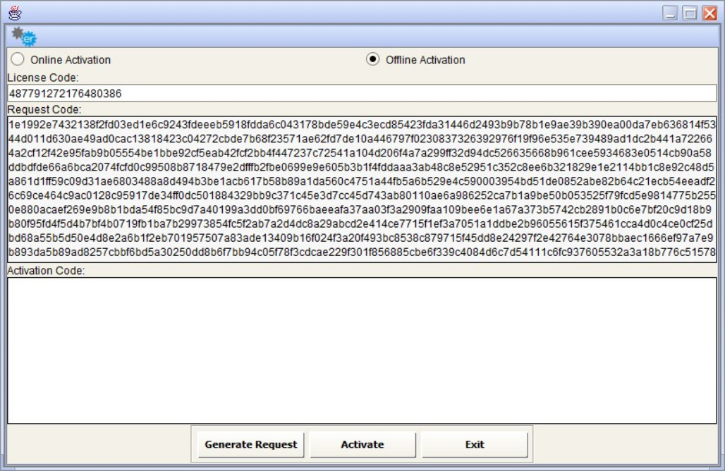 For offline licensing, a request code must be generated. This window should not be closed until the product activation is complete, as a new request would otherwise need to be generated.