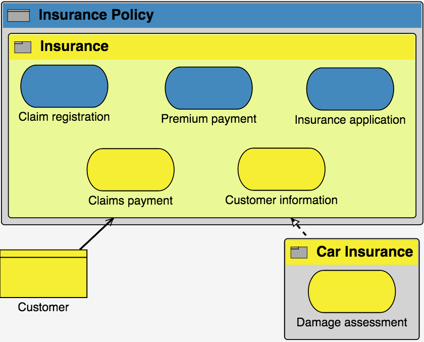 Product, Value, Contract, Business service, Business interface, Business event, Business process, Business function, Business interaction, Business role, Business actor, Application service, Application interface and Application component.