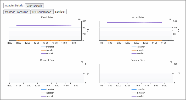 The Servlets tab displays graphs that indicate the rates of read, write and request rates for the individual Adapter servlets: transfer, installer, and servlet, over the selected time range. It also shows the percentage of time the adapter spends on the requests coming from these components.