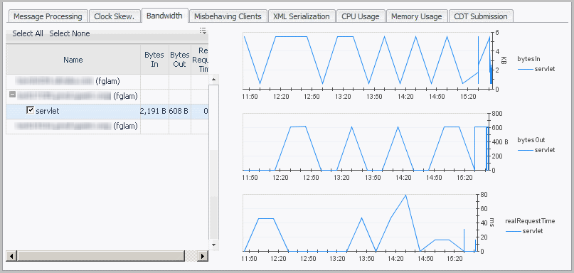 The Bandwidth tab displays metrics for bandwidth usage samples taken at prescribed intervals per second for a selected Agent Manager instance, including the bytes in, bytes out, and real request time for a selected servlet. The bandwidth statistics reflect the bandwidth (bytes per second) used by the Agent Manager instance data over a specific time interval.