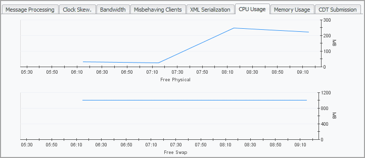 The Memory Usage tab displays the amount of available memory and swap space for a selected Agent Manager instance. For example, a shortage of swap space often suggests a memory shortage, while a decline in the available memory may indicate a memory leaking process.