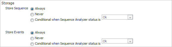 Conditional when sequence analyzer status is—Data is stored only when the status of the sequence analyzer matches the status you select in the list.