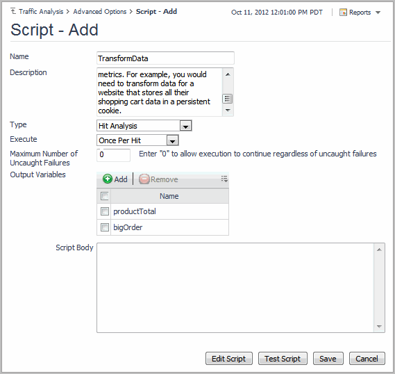 You can create scripts from the Traffic Analysis > Advanced Options dashboard or from any dashboard that offers a Scripts view. From the Advanced Options dashboard, when you click Add in the Scripts view, the Script - Add dashboard appears. From all other locations, when you click Add, you can choose to use an existing script or create a new one. If you create a new one, the Script - Add dialog box appears.You specify the analysis API, execute policy, uncaught failure policy, and output variables that you decided upon when determining your script requirements. For more information, see Determining requirements and Adding, copying, and editing scripts.