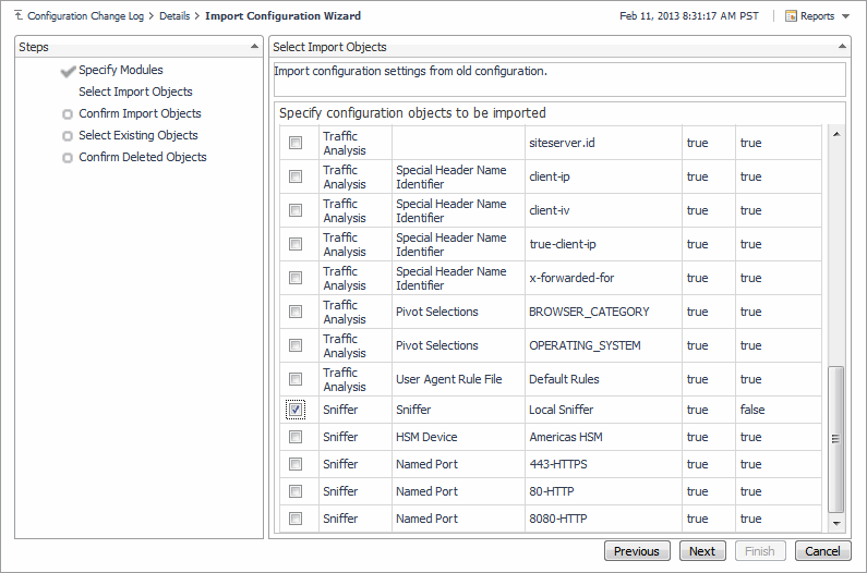 In the Select Import Objects screen, for all modules set to Import Selected Objects, the objects in the modules are displayed. Select the objects that you want to import. They will replace objects in the current configuration.