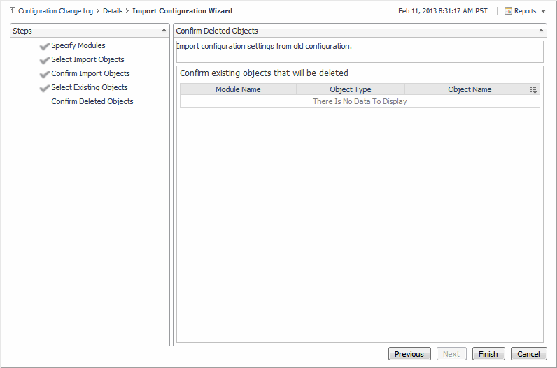 NOTE: If no modules were set to Import Selected Objects, this screen is empty. Click Next.