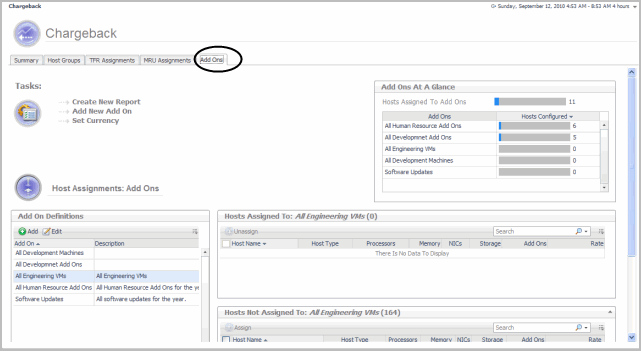 Add Ons At A Glance—this view provides a quick visual summary of the hosts that have been assigned to Add Ons as well as a visual breakdown of the host assignments within that model. |
