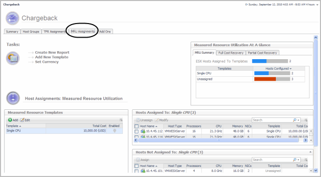 Measured Resource Utilization At A Glance—this view provides a quick visual summary of the hosts that have been assigned to the measured resource utilization model, as well as a visual breakdown of the host assignments within that model. This view contains a summary tab and tabs for both partial cost recovery and full cost recovery. All templates and their assigned hosts are listed under the tabs. |