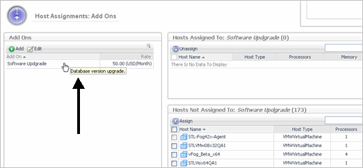 Hosts Assigned To—this table lists all hosts that are assigned to the Add On selected in the Add On Definitions list. Hosts can be searched for, selected, and removed from the assigned table. To remove a host from this table, select it from the list and click the Unassign button on the toolbar. This moves the selected host into the Unassigned table, and disassociates it from the selected Add On. Each column in the table can be sorted based on individual preferences. |
