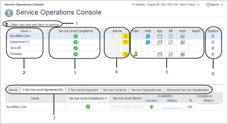 7. Service Operations Console tabs: Display details for the selected category or service, such as its contents and dependencies. See the User Guide for details.