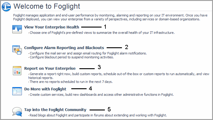 The first time you log in to Foglight, the Welcome page appears in the display area. The Welcome page lists commonly performed tasks and provides easy access to typically used dashboards. Most dashboards that can be accessed from this page can also be accessed from Homes in the navigation panel. The dashboards that you can access from the Welcome page depend on the roles associated with your user account. For example, users with the Administrator role have access to a wider range of dashboards than the users with an Operator role. For information about users and roles in Foglight, see the Administration and Configuration Help.