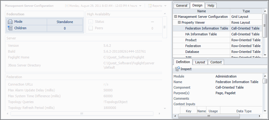 Web Component Framework (WCF) definitions such as views and queries in Foglight® are organized into modules and sub-modules. A module is a collection of related WCF definitions. Each module in Foglight contains a collection of operational elements such as views, dashboards, sub-modules, and other entities. The Definitions Statistics dashboard gives a quick overview of how views are used in individual modules or sub-modules. It also shows the relationship of components such as views or associations with other components.