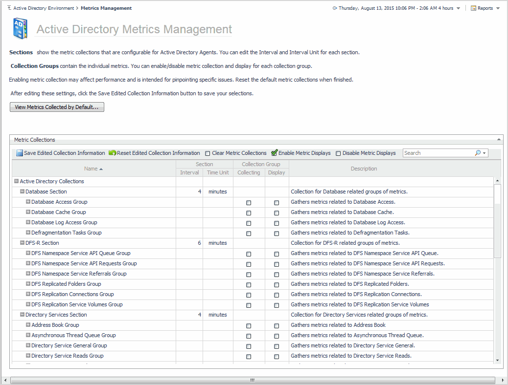 From the Active Directory Metrics Management page, select the View Metrics Collected by Default button. |