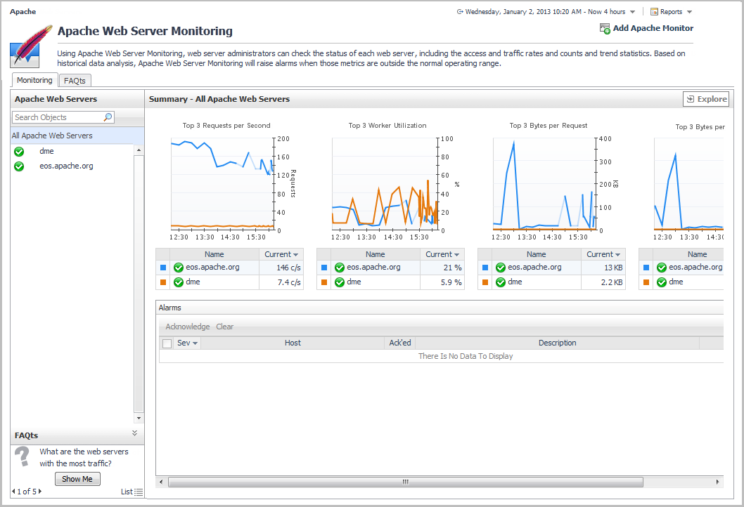 The Apache Web Server Monitoring dashboard provides summary views of all monitored web servers and individual web server views. These views help you quickly compare web server performance, determine worker utilization and traffic levels, and view any alarms that have occurred.