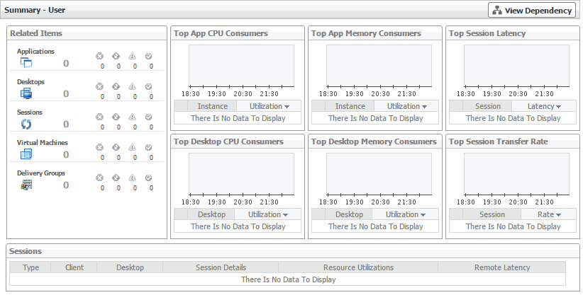 The Dependency tab helps you understand the dependencies between the XenDesktop components associated with the selected session. The dependency map displays the relationships between the XenDesktop user, Desktop, virtual machine, datastore, and physical host. For complete information about dependency maps, see Viewing object dependencies .