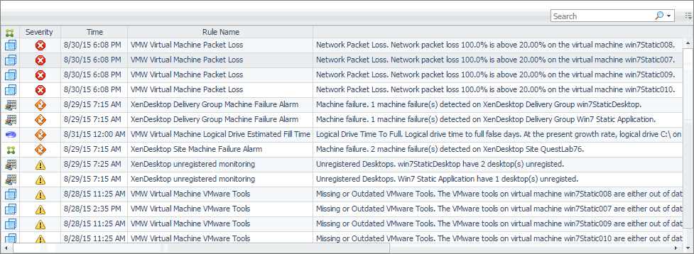 The XenDesktop Alarms dashboard displays a table containing all alarms fired against your monitored objects. For each alarm entry, it displays the associated object type, the alarm severity, when it was generated, the rule name that triggered the alarm, and the alarm message.