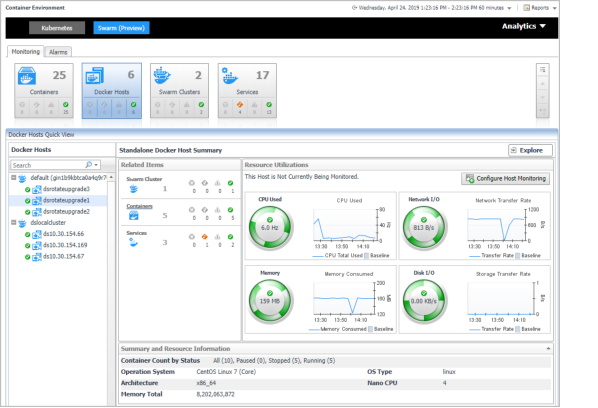 Summary and Resource Information: Displays the detailed information about the selected docker host, including Container Count by Status, Operating System, Memory Total, and so on. |