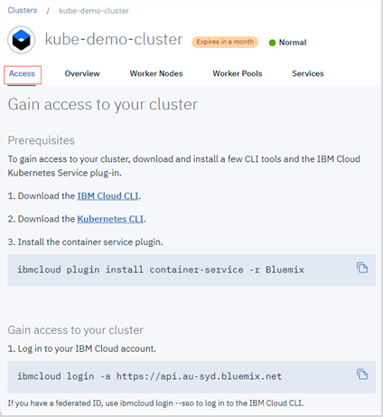 If you have created your cluster on IBM Cloud Kubernetes Service, get the access from the console as described on the cluster’s Access view. You will get a .pem file and a .yml file after you performing the steps.