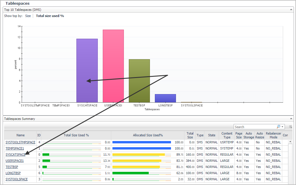 The Tablespaces panel shows the top ten tablespaces with the highest percentage of the space usage, along with individual table properties for each individual tablespace. Use this panel to quickly investigate the existing tablespace usage and look for parameters that can indicate potential performance issues.