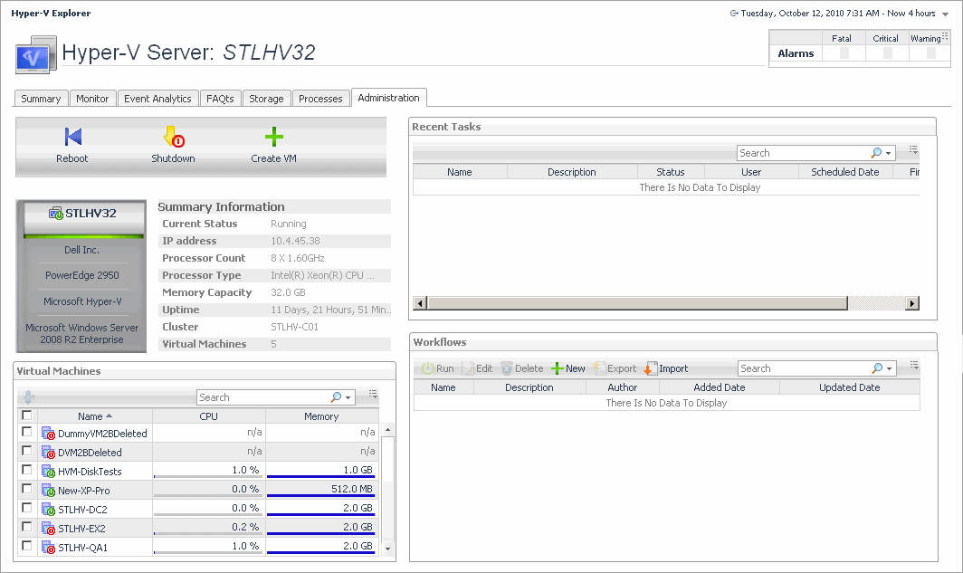 NOTE: The Hyper-V Explorer Administration tab is only available when the Virtual-HyperV-Admin and Virtual-HyperV cartridges are installed. It is accessible if your Foglight™ user account includes the Hyper-V Automation User role, while exploring individual servers and virtual machines. |
