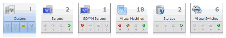 This view appears in the upper part of the Monitoring tab, just above the Quick-View. It displays a high-level overview of the selected virtual environment. The view has a tile for each type of object in your virtual infrastructure: Clusters, Servers, and Virtual Machines.