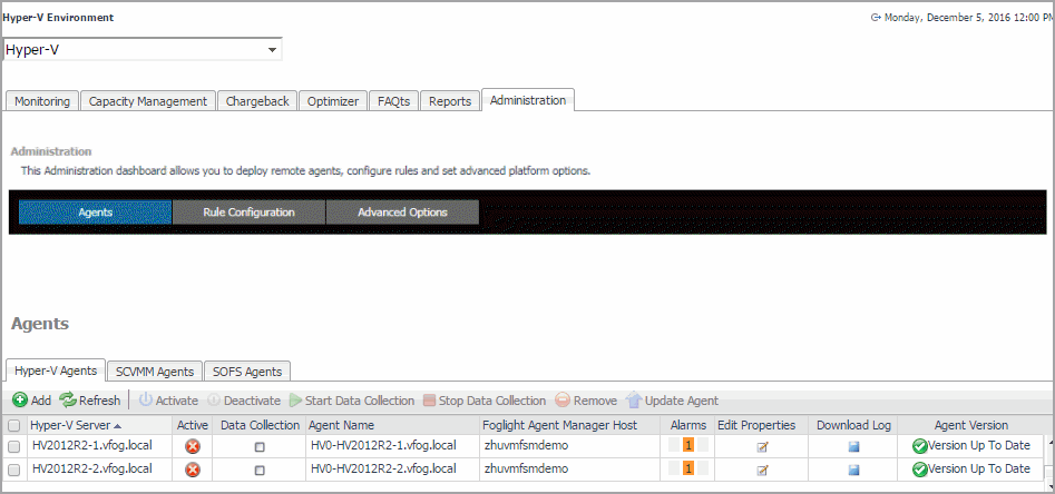 Agents: Review existing Hyper-V/SOFS/SCVMM object instances. For more information, see Agents view commands.