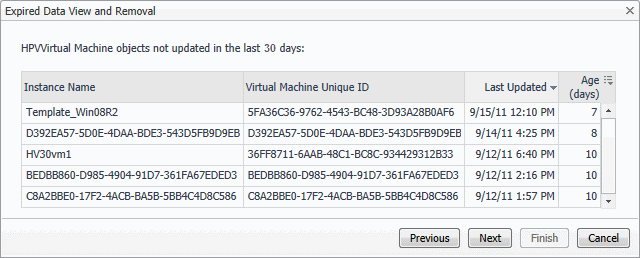 The Expired Data View and Removal dialog box refreshes, showing the object instances that meet the specified requirements.