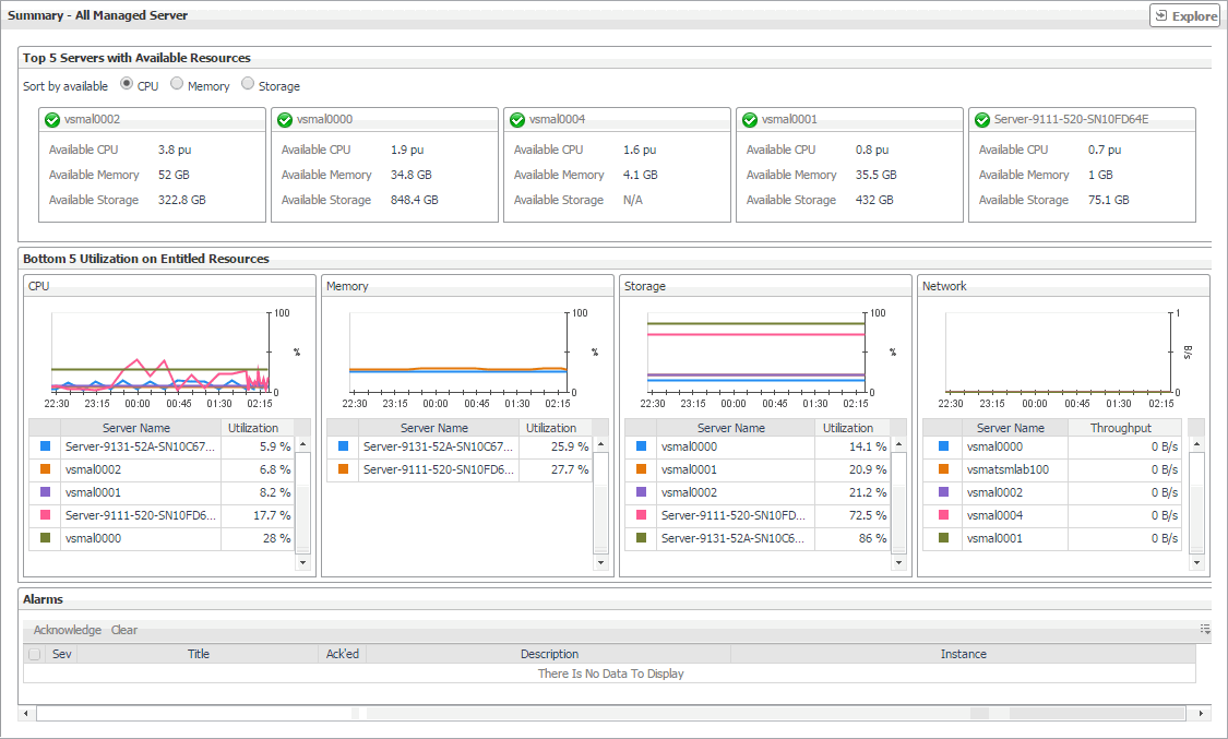 The Selected Service PowerVM view appearing immediately below the tiles allows you to select a specific instance of the tile selection. From here, you can drill down on a desired object instance, and review the metrics associated with the selected object.