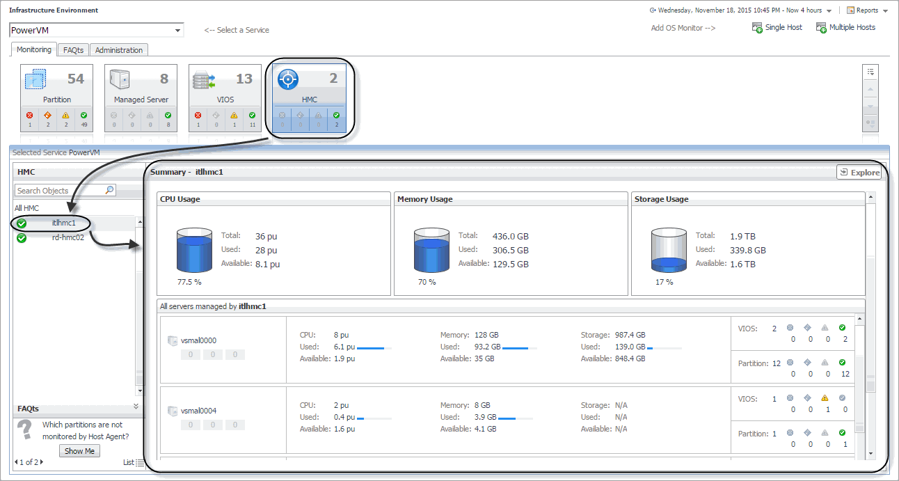 The Monitoring tab displays main components of your monitored PowerVM infrastructure such as HMC instances, managed servers, partitions, and VIOS instances. When you navigate to the Infrastructure Environment dashboard and select the PowerVM service for the first time, the Monitoring tab appears open.