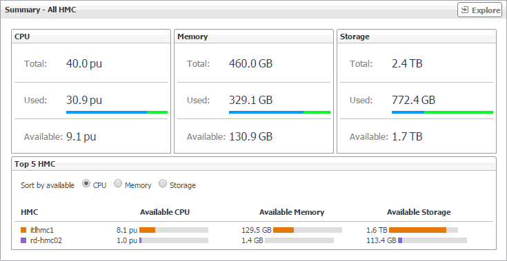 The Summary - All HMC view displays the levels of total, used, and available processor, memory, and disk resources for all HMCs in your integrated infrastructure. This view appears in the Selected Service PowerVM view when you select All HMCs in the HMC view on the left. It identifies the elements with the highest available levels of these resources.