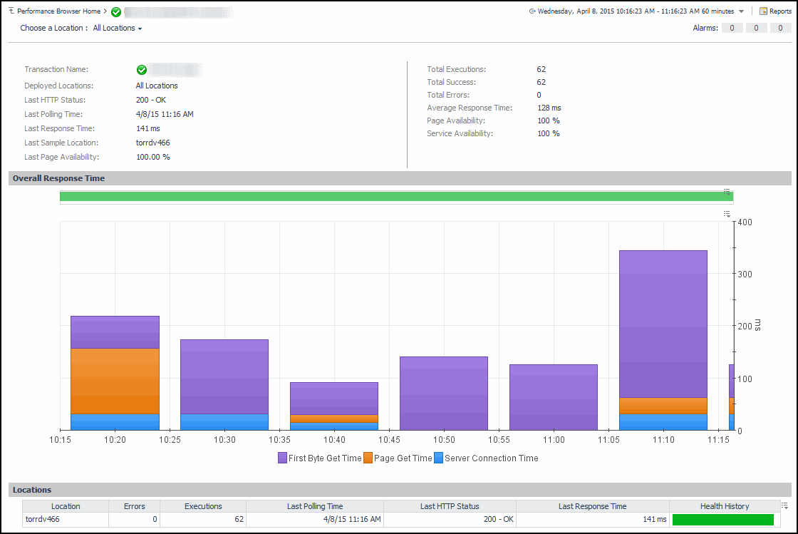 The top part of this view show a number of metrics resulted from monitoring that transaction from the selected location. The bottom part of this view shows a graph indicating the total transaction response times over the selected time range. High peaks in the graph often suggest potential bottlenecks and likely need to be investigated. For complete information about the data appearing on this view, see Transaction at a Selected Location drilldown view.