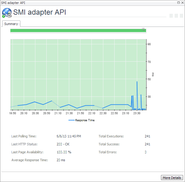 Response Time. The amount of time the Web site takes to respond to monitoring requests, over the selected time range. High values in the graph can indicate potential bottlenecks that likely need to be investigated.