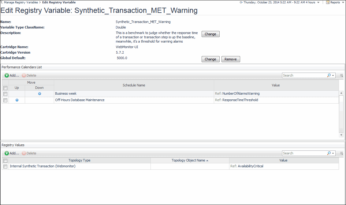 Any changes you make to transaction alarm thresholds results in creating topology-scoped values of the registry variables that control these thresholds, and the other way around. The topology type used to contain Web transaction definitions is Internal Synthetic Transaction (Webmonitor), and the Internal Synthetic Transaction (Webmonitor) topology object names are the configured transactions names.