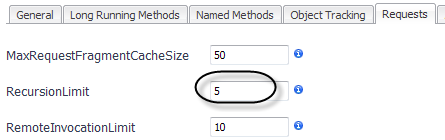 The RecursionLimit configuration setting adjusts the number of recursive calls for which the Java EE agent collects detailed performance information. Beyond this number, the Java EE agent collects and aggregates timing information for the entire recursive sequence.