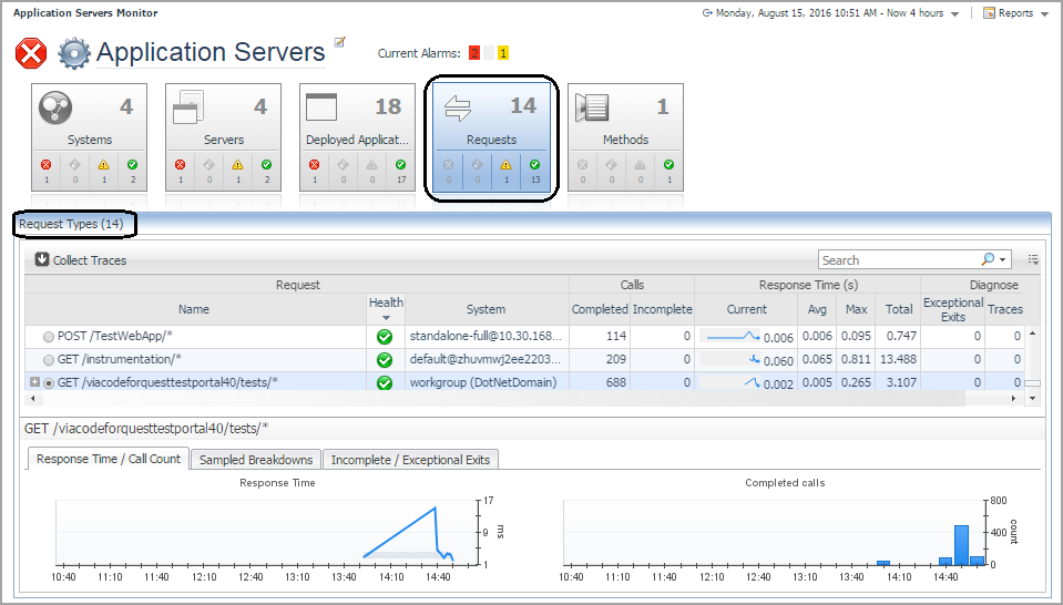 You can also monitor requests and generate reports on response time through this dashboard. An alarm fires when a request falls outside of its predefined conditions, and the alarm appears in the Application Servers Monitor dashboard > Requests view.