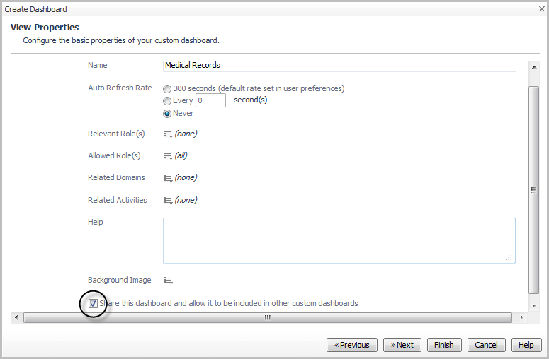 Select the Share this dashboard and allow it to be included in other custom dashboards check box.
