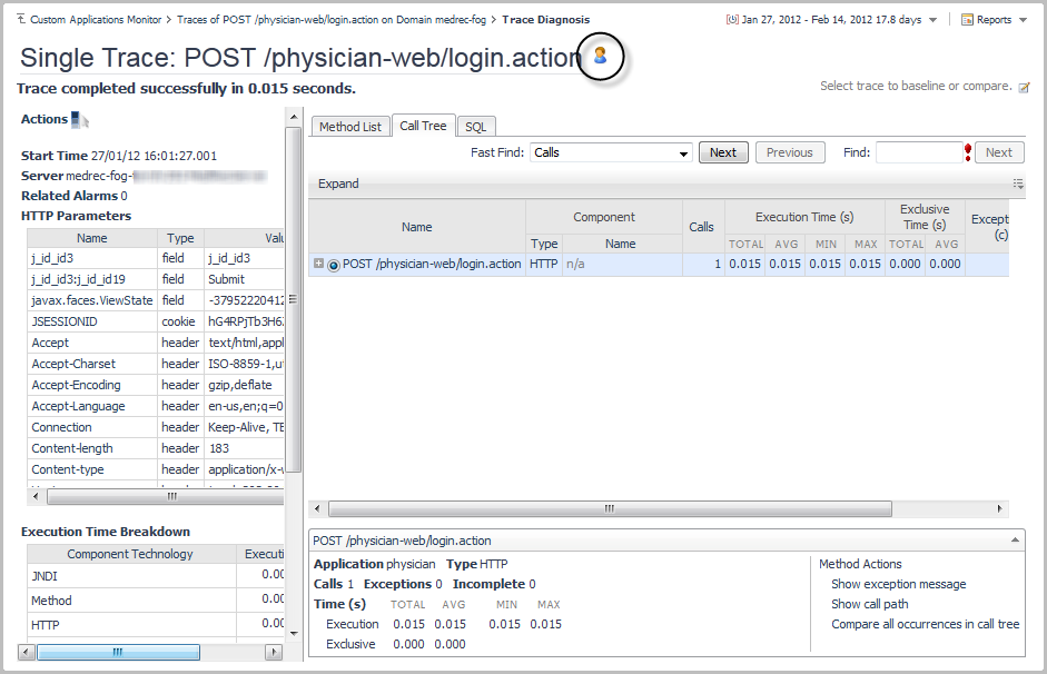 On the Application Servers > Monitor > Requests view, select a trace to view the single trace details. |