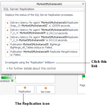 Click the link Investigate via Replication dashboard in the SQL Server Replication pop-up, which appears when you click the Replication icon under the Background Processes section of the instance's home page.