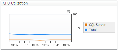 The CPU Utilization chart displays the amount of CPU being used by SQL Server compared with the total being used by all processes in Windows.