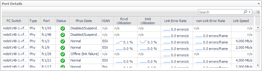 Port Details. For each switch-plus-port combination, displays the name and type of switch and the port name, status, and physical state. The metrics represent current values for Rcvd Utilization, Xmit Utilization, Link Error Rate, Non-Link Error Rate, and Link Speed. Click a Sparkline to plot metric values over the time period.