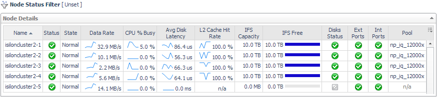 Node Details. For each member node, displays its name, status, physical state, and current values for Data Rate, % Busy, Latency, L2 Cache Hit Rate, IFS Capacity, and IFS Capacity: Free. Also displays the worst status of the node’s disks, external network ports, and internal network ports, and identifies the node’s parent pool. Click a |